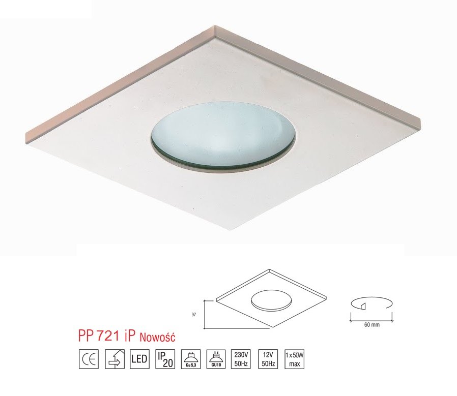 Hermetyczna oprawa wpuszczana ze stopniem szczelności IP44 na żarówkę typu PAR16 oraz MR16. Wykonana z aluminium lakierowanego na kolor biały oraz matowego szkła. Dzięki wysokiemu stopniu szczelności lampa może być zamontowana w pomieszczeniach, gdzie występuje ryzyko kontatku z wodą lub dużą wilgotnością powietrza.